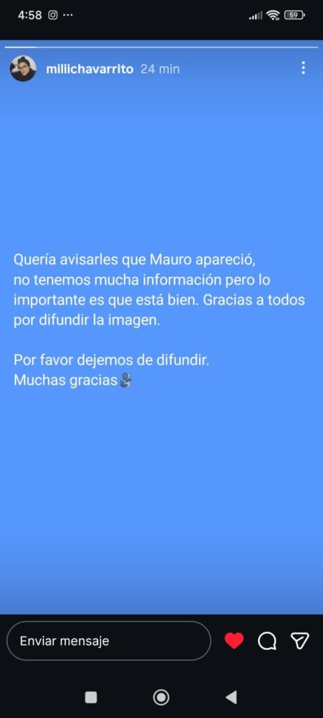 «No tenemos mucha información, pero lo importante es que está bien», publicó una compañera que había estado participando activamente de la búsqueda. Al mismo tiempo, agradeció la difusión de la imagen del muchacho para poder dar con su paradero.