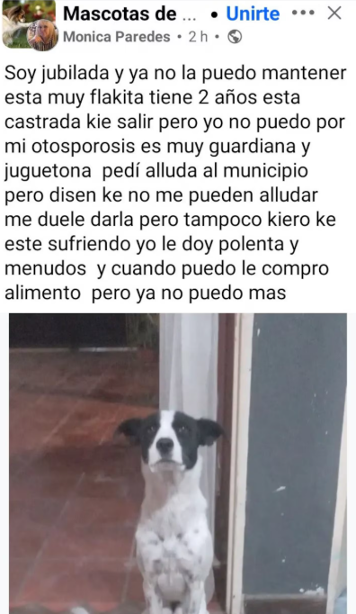 Conmovida por el estado de su mascota y sin poder afrontar gastos básicos como alimento y atención veterinaria, decidió hacer un posteo en un grupo de Facebook para buscarle un nuevo hogar. “Me duele darla, pero tampoco quiero que esté sufriendo”, expresó en ese mensaje, donde también contó que la alimentaba como podía y que incluso había pedido ayuda sin éxito.